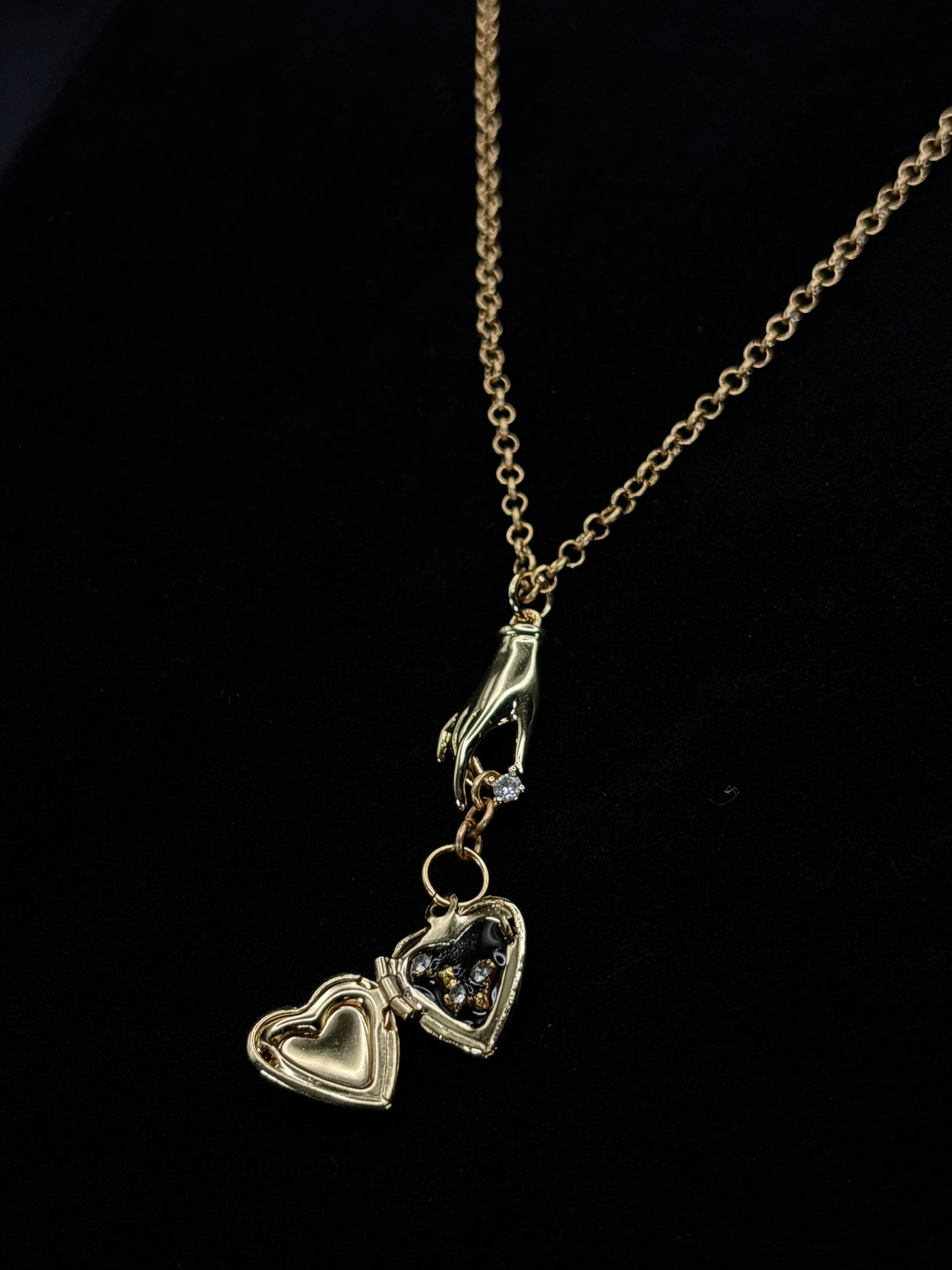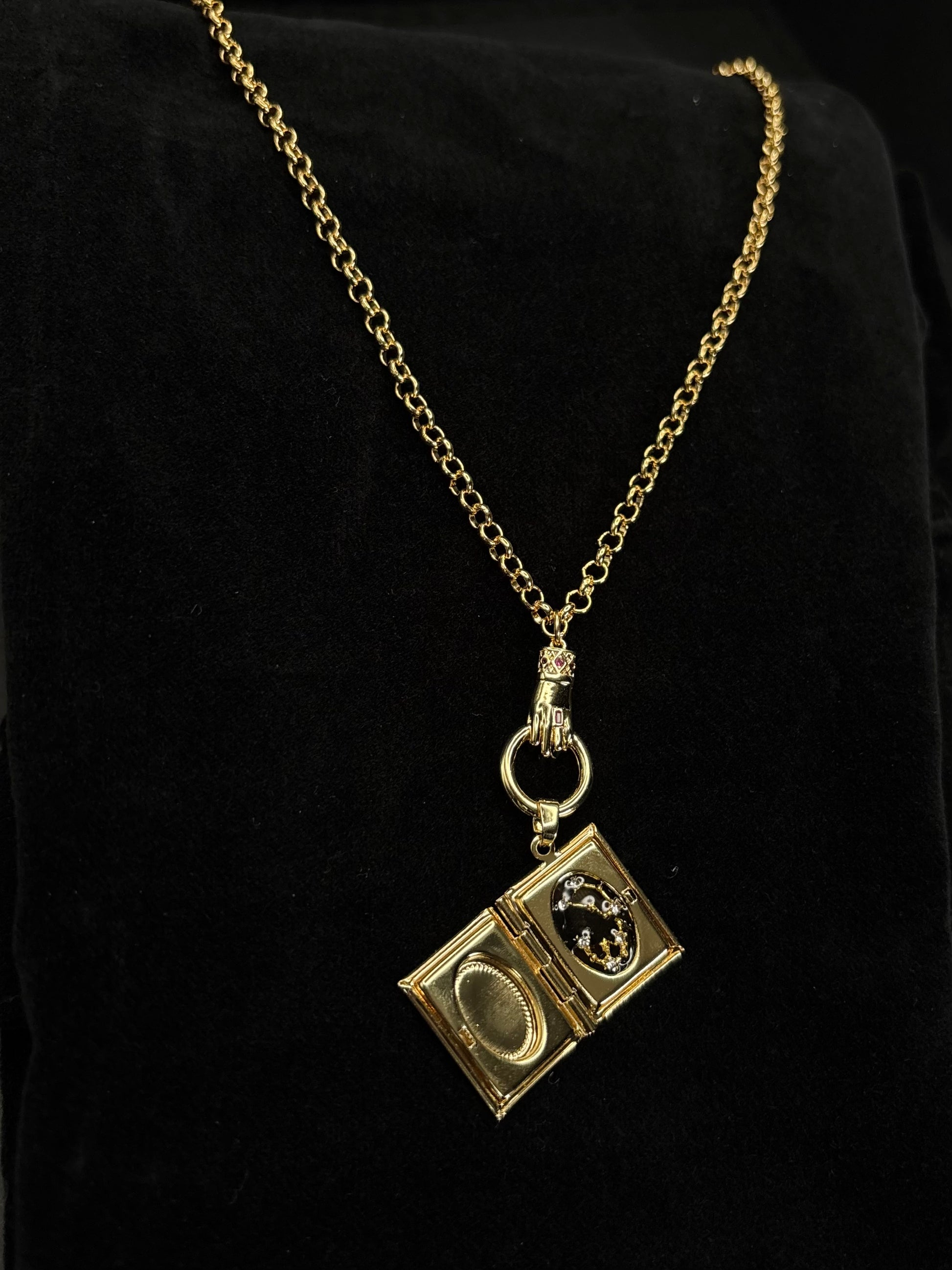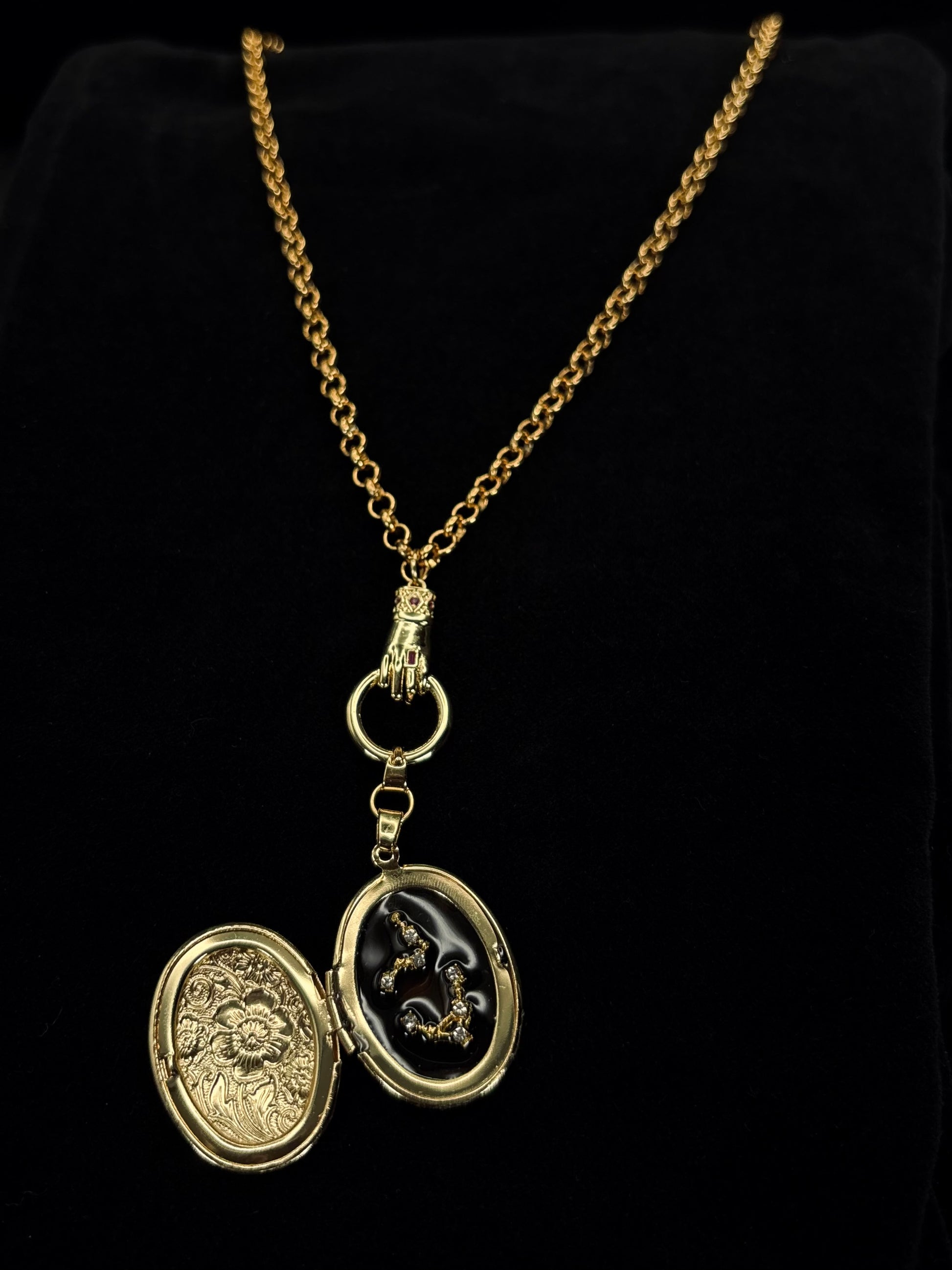 Inspired by Victorian morning locket, and the symbolism of celestial navigation, the Fatekeeper is designed as a vessel for the unseen threads that a constellation preserved within, a fragment of the night sky carried close to the heart. Suspended from the divining hand, an age old symbol of fate and fortune, the locket becomes both ornament and Talisman.