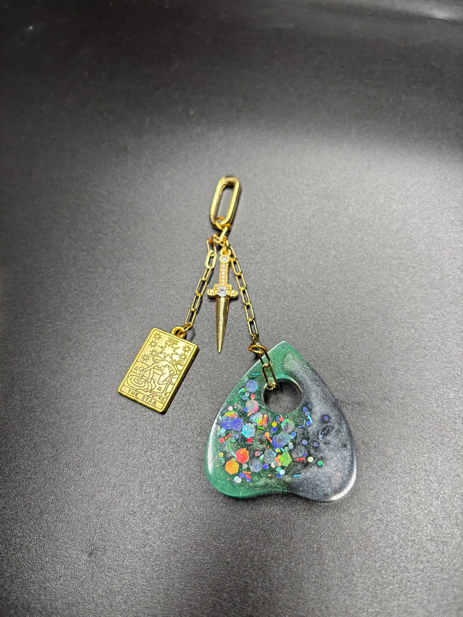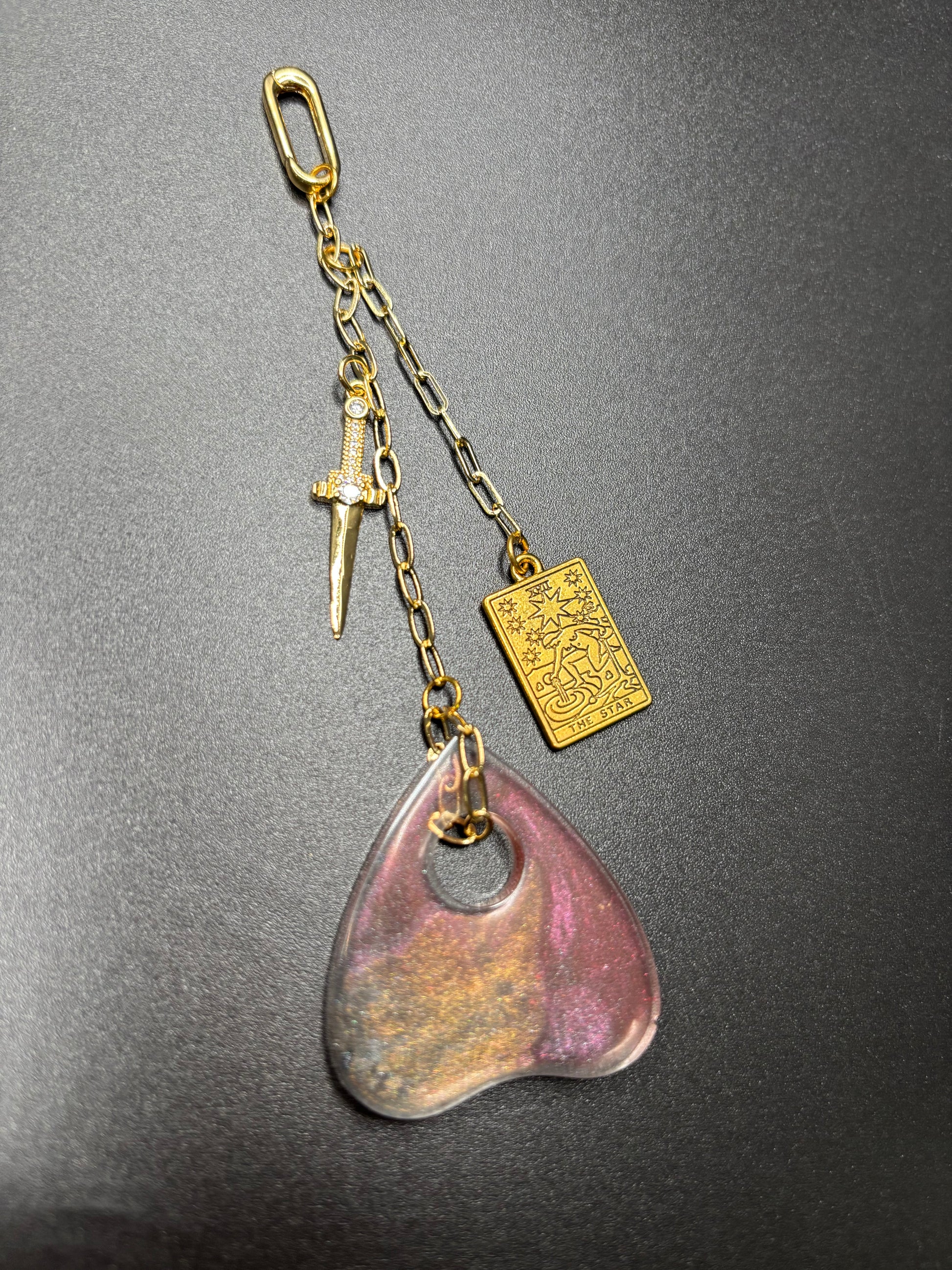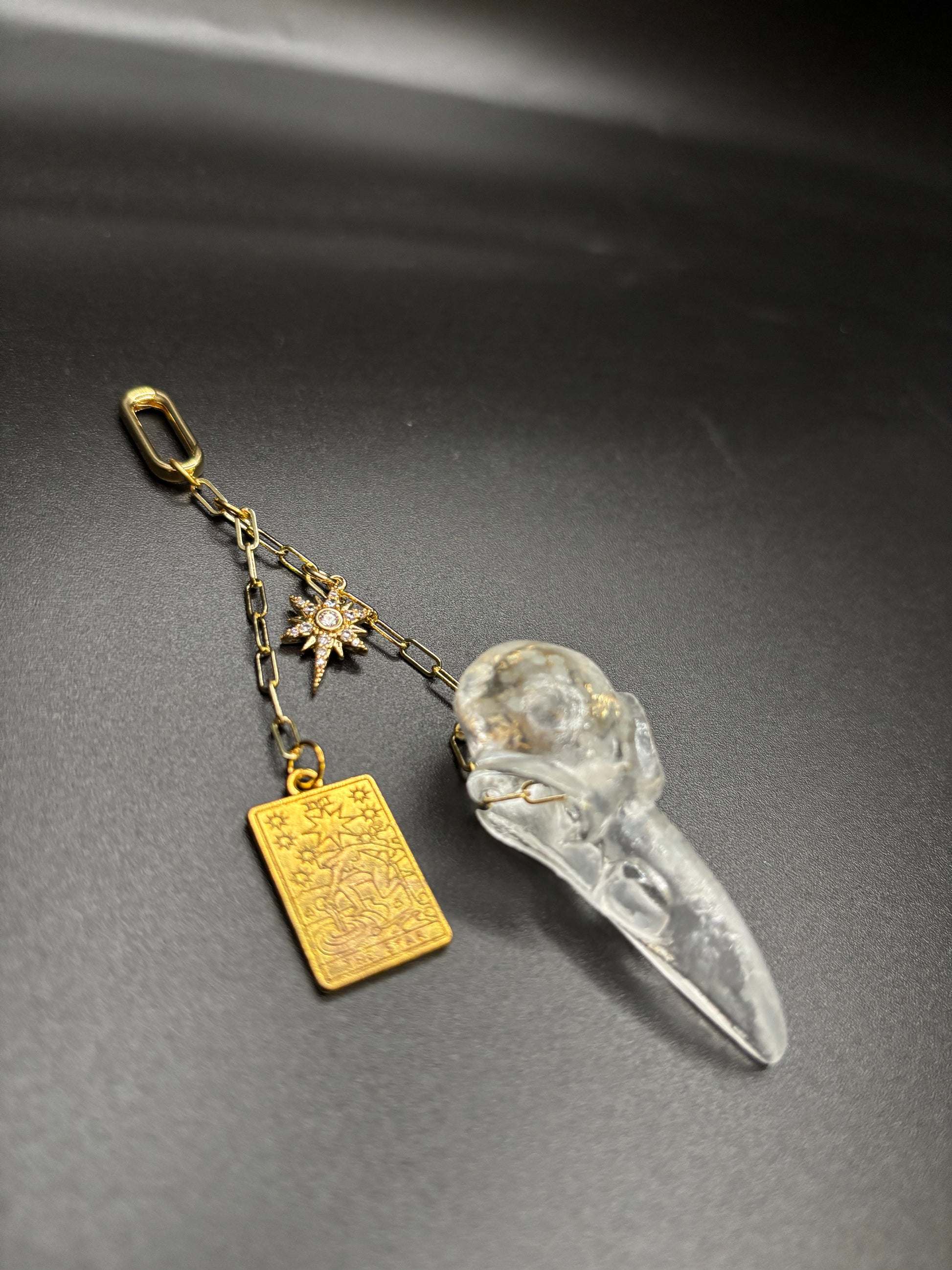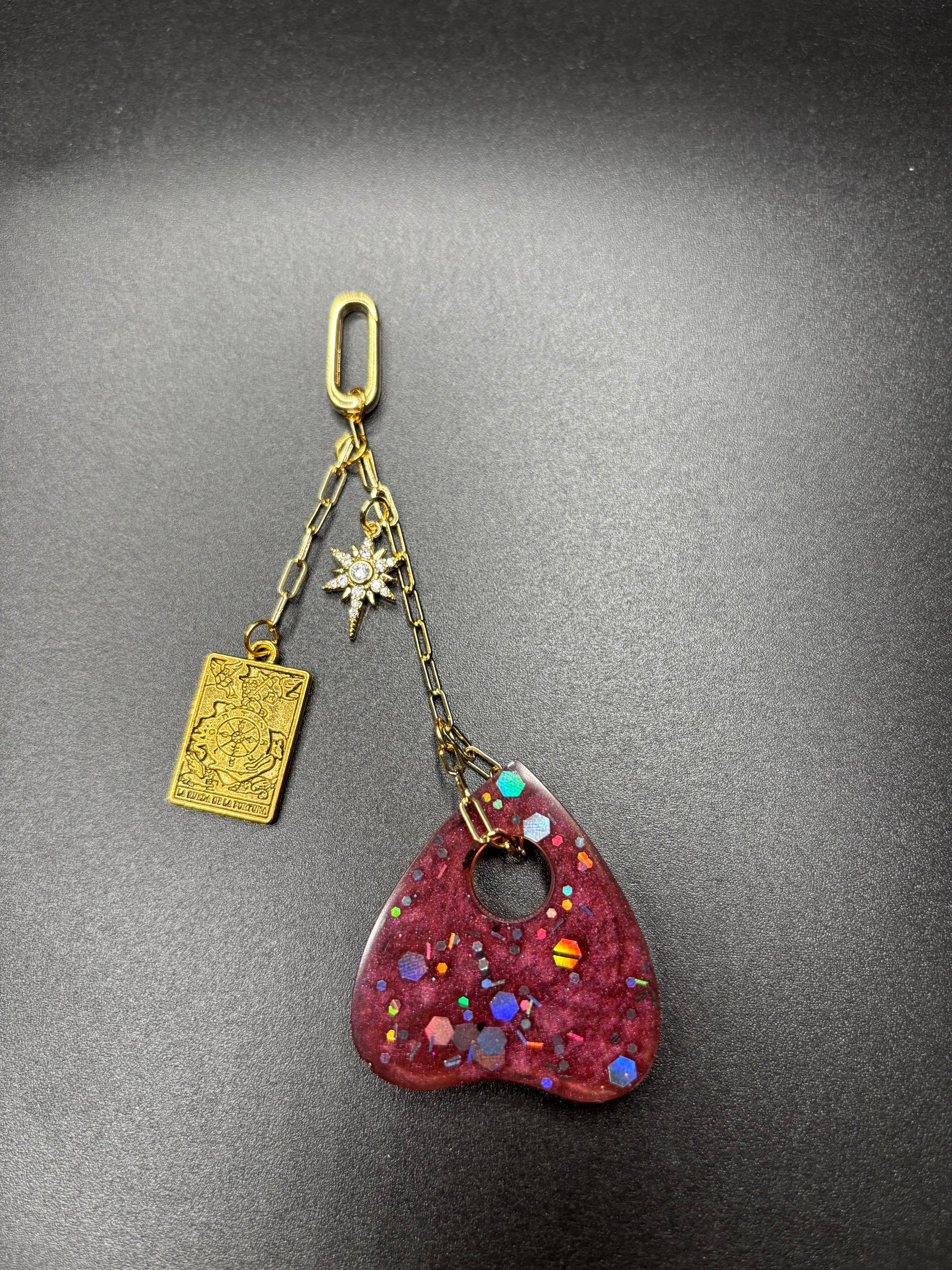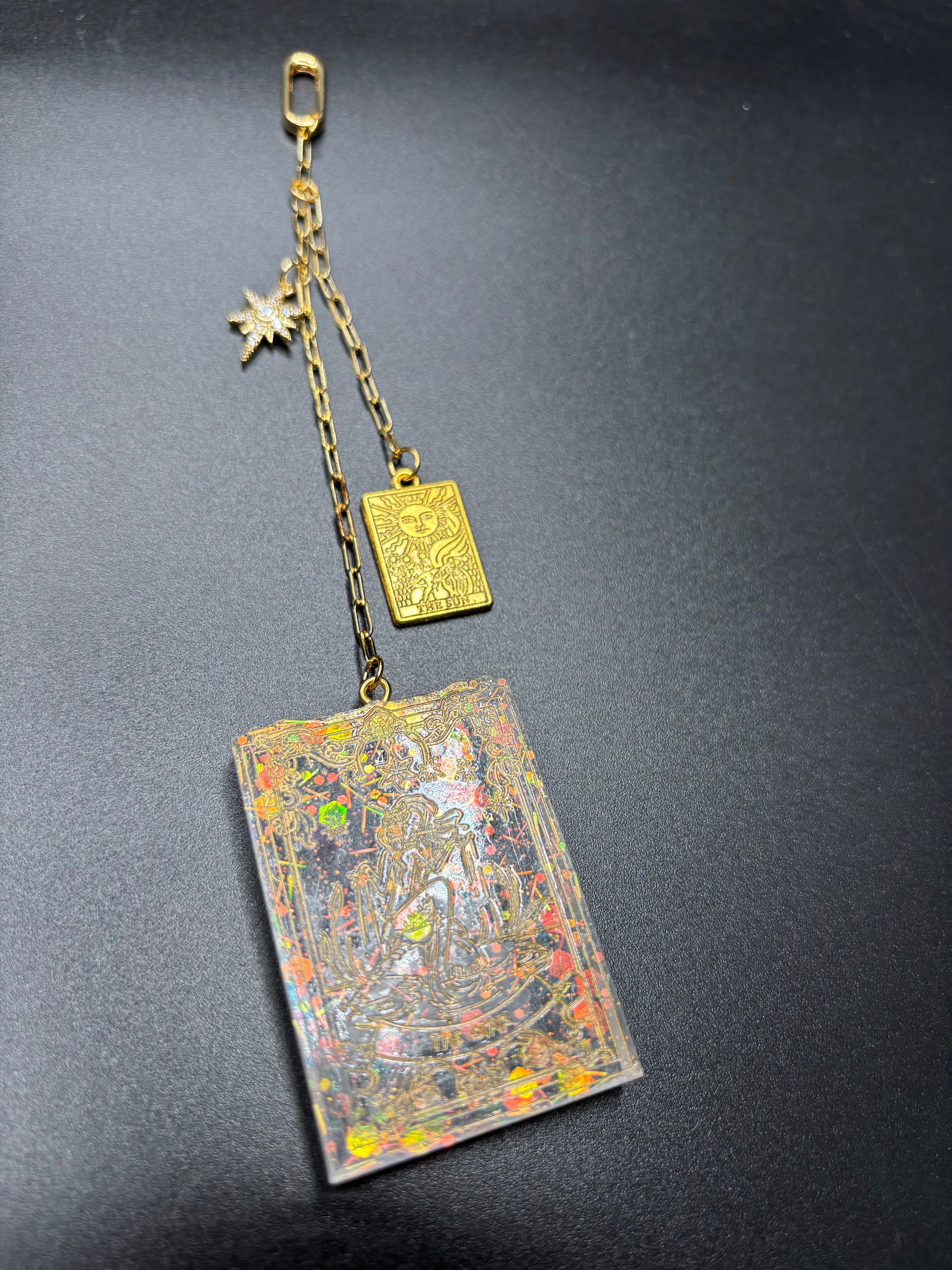 Each Talisman is a handcrafted, portable piece of celestial magic designed to carry the wisdom of the Major Arcana with you. These Talismans feature a hand painted Tarot charm forged from Assorted, one of a kind resin pours. Adorned with 18K gold plated accents, secured with a spring clasp, and a combination of gold plated charms set with sparkling cubic zirconia. Suspended from an 18k gold plated chain, ensuring that your connection to the divine is always close at hand.